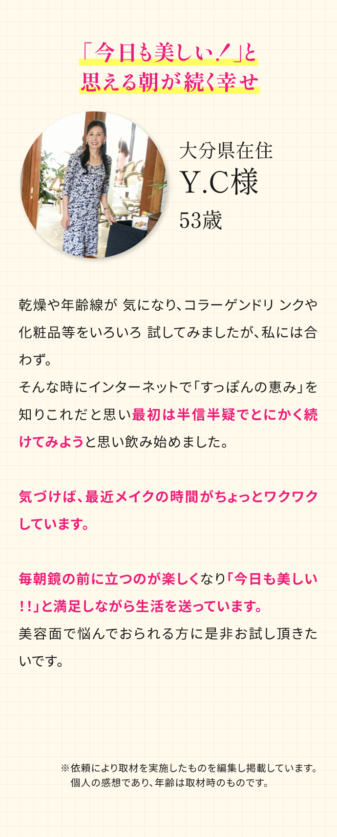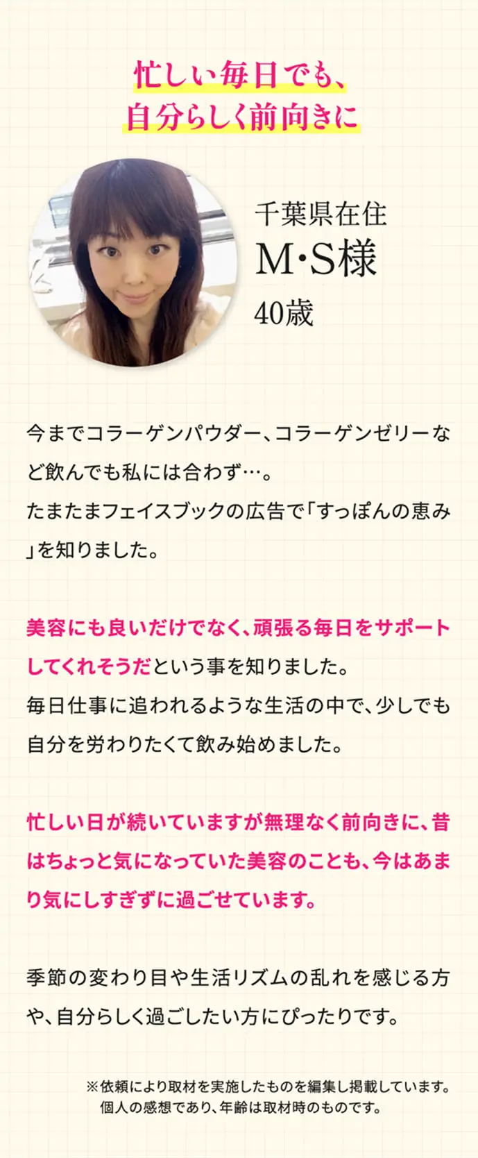 今では多くのお客様からご愛顧いただき、私自身も「やってきたことは間違いじゃなかった」と心から嬉しく思っています。私も毎日欠かさず「すっぽんの恵み」を飲んでいます。必要なのは“補うケア”──それを叶えるのが、毎日の“飲むすっぽん習慣”なんです。