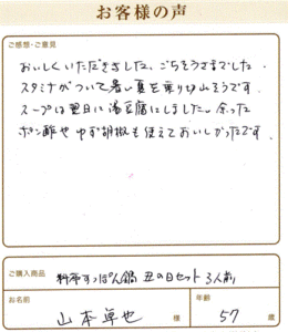 ポン酢やゆず胡椒も使えておいしかった 山本章也様 東京都 57歳 おいしくいただきました。ごちそうさまでした。 スタミナがついて暑い夏を乗り切れそうです。 スープは翌日に湯豆腐にしました。 余ったポン酢やゆず胡椒も使えておいしかったです。 すっぽん鍋 2025年9月22日 すっぽん鍋男性 50代選択なし(料理用)