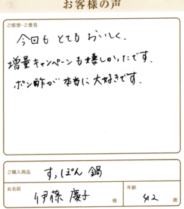 ポン酢が本当に大好きです 伊藤慶子様 東京都 42歳 今回もとてもおいしく、 増量キャンペーンも嬉しかったです。 ポン酢が本当に大好きです。 すっぽん鍋 2025年12月2日 すっぽん鍋女性 40代選択なし(料理用)