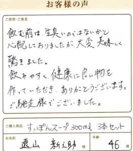 大変美味しく、驚きました 遠山新之助様 神奈川県 46歳 飲む前は、生臭いのではないかと心配しておりましたが、 大変美味しく、驚きました。 飲みやすく、健康に良い物を作っていただき、ありがとうございます。 ご馳走様でございました。 すっぽんスープ 2026年3月6日 すっぽんスープ男性 40代選択なし(料理用)