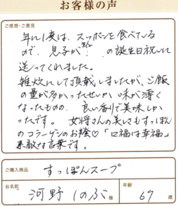 一口で美味しいと感じました 青木美咲様 愛知県 73歳 ①人生初めてのスッポン鍋をいただきました。 恐る恐るでしたが、一口で美味しいと感じました。 ポン酢、柚子こしょうともバランスの良い味つけで、大満足しました。 ②百寿酒も臭みもなく、ポカポカと体が温まりました。これは、しばらく続けたいです。 ③スープは何にでも使えて、残さずいただけるので美味しくうれしい味です。 すっぽんスープすっぽん鍋その他 2025年12月17日 すっぽんスープすっぽん鍋その他女性 70代以上選択なし(料理用) 詳しくはこちら