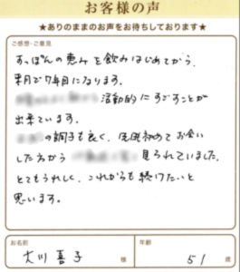 朝から活動的にすごすことが出来ています。 大川喜子様 神奈川県 51歳 すっぽんの恵みを飲み始めてから 来月で7年目になります。 朝からシャキッとして活動的にすごすことが 出来ています。 見た目の調子も良く、先日も初めてお会いした方から 若々しいと見られていました。 とてもうれしく、これからも続けたいと思います。 すっぽんの恵み ゴールド 2024年11月26日 すっぽんの恵み ゴールド女性 50代毎日の習慣(〜2年間) 詳しくはこちら