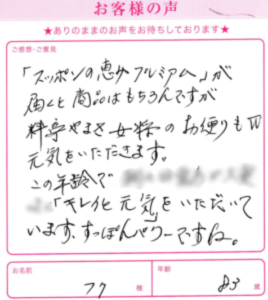 「スッポンの恵みプレミアム」が届くと商品はもちろんですが 料亭やまさ女将のお便りもW元気をいただきます。 この年齢で朝スッキリ起きることができて 「キレイと元気」をいただいています。 すっぽんパワーですね。