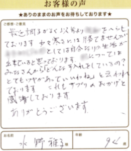最近調子がよく以前より量をへらしております。 少々寒さには勝てませんが年齢的としては自分なりの 生活が出来ていると思っております。 見た目についてはみなさんから「どんな手入れをしているの?とても ツヤがあっていいわね」と云われております。 これもサプリのおかげと感謝しております。 ありがとうございます。