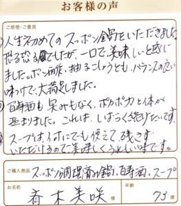 一口で美味しいと感じました 青木美咲様 愛知県 73歳 ①人生初めてのスッポン鍋をいただきました。 恐る恐るでしたが、一口で美味しいと感じました。 ポン酢、柚子こしょうともバランスの良い味つけで、大満足しました。 ②百寿酒も臭みもなく、ポカポカと体が温まりました。これは、しばらく続けたいです。 ③スープは何にでも使えて、残さずいただけるので美味しくうれしい味です。 すっぽんスープすっぽん鍋その他 2025年12月17日 すっぽんスープすっぽん鍋その他女性 70代以上選択なし(料理用) 詳しくはこちら