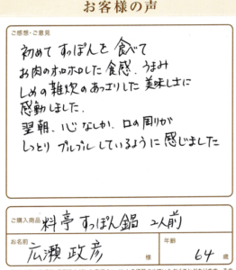 一人鍋で、お酒を共にいただいてます。最高。 松村和宜様 奈良県 79歳 いつ、食しても味にはずれなし。 3人前を私が2回に分け、一人鍋でお酒を共にいただいてます。最高。 妻は、ぞうすいが一番好きのようです。 すっぽん鍋 2026年3月24日 すっぽん鍋男性70代以上選択なし(料理用) 詳しくはこちら