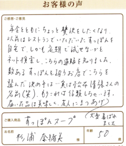 届いた品は美味しく、友人に1つあげ大変喜ばれました 杉浦奈緒美様 神奈川県 50歳 年令とともにちょっと贅沢をしたくなり 以前はレストランでいただいていたすっぽんを 自宅で、しかも定期で試せないかと ネット検索し、こちらの通販を知りました。 数あるすっぽんを扱うお店でこちらを 選んだ決め手は…実は松本清張さん名前(笑)。 もうこれは信頼しちゃいます。 届いた品は美味しく、友人に1つあげ大変喜ばれました。 すっぽんスープ 2026年4月24日 すっぽんスープ女性 50代選択なし(料理用) 詳しくはこちら