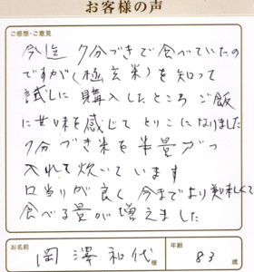 今までより美味しくて食べる量が増えました 岡澤和代様 京都府 83歳 今迄7分づきで食べていたのですが(極玄米)を知って試しに購入したところ ご飯に甘味を感じてとりこになりました。 7分づき米を半量づつ入れて炊いています。 口当りが良く、今までより美味しくて食べる量が増えました。 その他玄米 2025年11月10日 その他女性 70代以上玄米選択なし(料理用) 詳しくはこちら