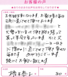 毎日元気に過ごさせて頂いております 橋本泰子様 栃木県 80歳 お世話様になります。 お影様で毎日元気に過ごさせて頂いております。 ツヤがあると大勢の方に言って頂き、 胸を張って笑って年齢を言っています。 そして又、一日一日を心穏やかに過ごさせて頂き幸せな毎日です。 ありがとうございます。続けてお願い致します。 すっぽんの恵みプレミアム 2025年12月24日 すっぽんの恵みプレミアム女性 70代以上2年以上継続中 詳しくはこちら