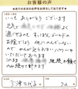 毎日元気で継続を願ってのみ続けて行きます 今津三代子様 福岡県 72歳 いつもありがとうございます。 元気で調子よく過ごせるのも すっぽんゴールドのお陰でしょう。 他にのんでいないので、かんがえられないパワーを いただいております。 このまま毎日元気で継続を願ってのみ続けて行きます。 すっぽんの恵み ゴールド 2025年8月15日 すっぽんの恵み ゴールド女性 70代以上2年以上継続中 詳しくはこちら