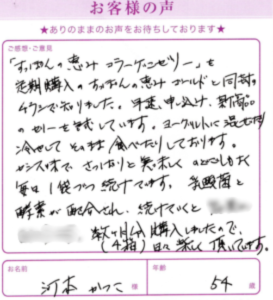 日々楽しく頂いています。 河本かつこ様 東京都 54歳 「すっぽんの恵みコラーゲンゼリー」を 定期購入のすっぽんの恵ゴールドと同封のチラシで知りました。 早速申し込み、新商品のゼリーを試しています。 ヨーグルトに混ぜたり、冷やしてそのまま食べたりしております。 カシス味でさっぱりと美味しく、のどごしもよく、毎日1袋づつ続けています。 乳酸菌と酵素が配合され、これからも続けていきたいと思います。 数ヶ月分(4箱)購入しましたので、日々楽しく頂いています。 すっぽんの恵み コラーゲンゼリー 2025年11月5日 すっぽんの恵み コラーゲンゼリーはじめて女性 50代 詳しくはこちら